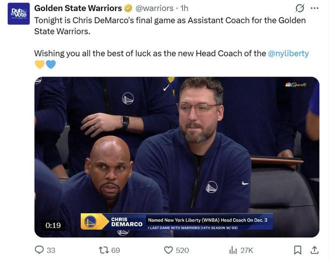 本場(chǎng)是克里斯德馬科擔(dān)任勇士助教的最后一場(chǎng)比賽,勇士官方送上祝福,根據(jù)此前Shams報(bào)道,紐約自由人已聘請(qǐng)其為主帥。