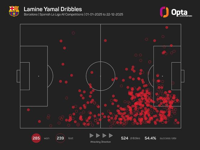 亞馬爾一共嘗試了524次過人,成功285次,過人成功率達(dá)到54.4%。此外,亞馬爾的過人基本都在他所處的右邊路完成。