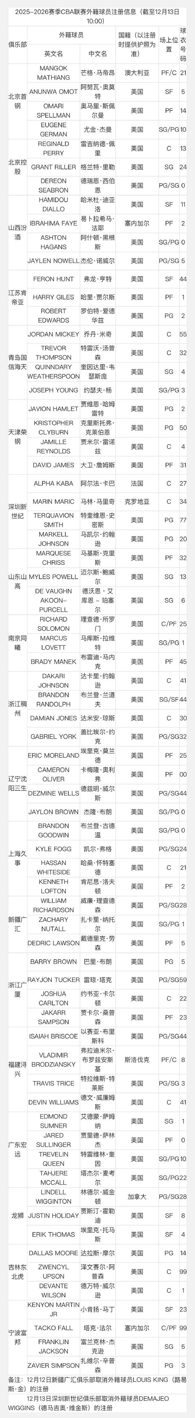 CBA官宣了新賽季外援注冊名單,一共是69名外援,其名單有外援的國籍、位置、球衣號碼等信息。