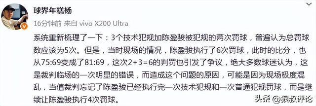 不久前,媒體人“球界年糕楊”發(fā)文提到了京遼大戰(zhàn)當(dāng)中,陳盈駿獲得6次罰球的話題做出點(diǎn)評(píng)。