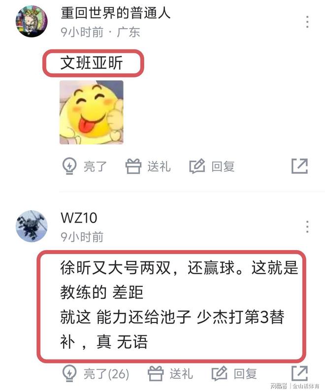 “峰:你在看嗎?”;“厲害離開廣東果然爆發(fā)”;“尷尬的誰?我不說了,廣州隊主教練當成寶培養(yǎng)是對的。”;“文班亞昕”;“徐昕又大號兩雙,還贏球。這就是教練的差距,就這能力還給池子,少杰打第3替補 ,真 無語”;“這就是我廣東的替補的替補,太強了”;“越來越適應了,這才三場比賽,一兩年以后徐昕不得打成姚明啊,徐昕真的被杜鋒廢了幾年”……