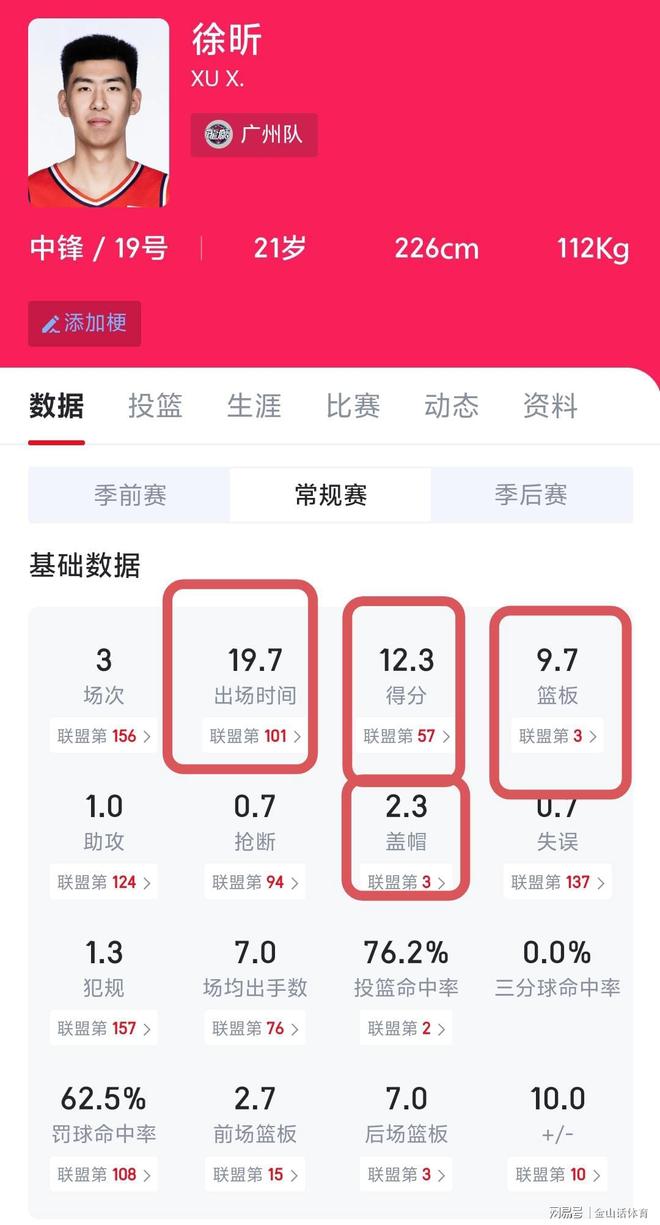 截止CBA常規(guī)賽前4輪(廣州隊少賽一輪),徐昕在代表廣州隊打的3場比賽里,均為首發(fā)登場,在場均19.7分鐘上場時間里,場均為球隊貢獻12.3分9.7籃板2.3蓋帽。