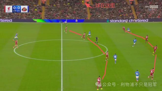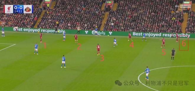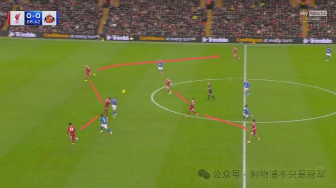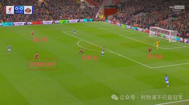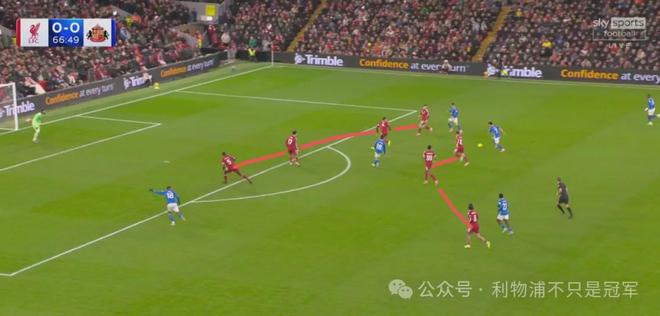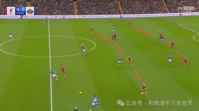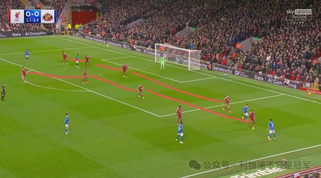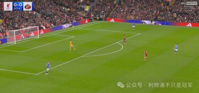 最明顯的是第20分鐘,在桑德蘭發(fā)出門球后,利物浦在整個前場只有伊薩克+維爾茨兩人,可以說基本放棄了前場逼搶,其他人都在后場沒過中線。
