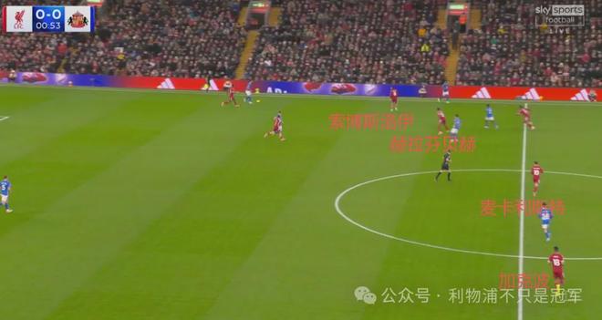 而一旦利物浦在前場投入重兵,必然造成后場空虛,比如下圖這一次,麥卡利斯特沖到前場想逼搶對手,結果桑德蘭馬上在他空出的位置長驅直入。