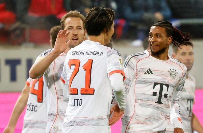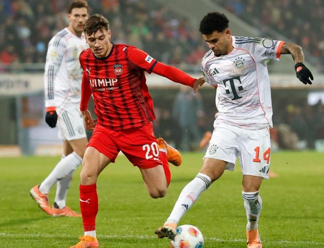 比賽第12分鐘,約納坦-塔在門前頭球攻門,頂?shù)锰?。門將站在原地就把球擋出。3分鐘后,拜仁進(jìn)球了!依靠角球機(jī)會(huì),斯塔尼希奇門前頭球補(bǔ)射破門。拜仁開局很順利。第32分鐘,拜仁再次進(jìn)球。伊藤洋輝的射門被擋了一下,皮球飛到門前。奧利塞輕松把球打進(jìn)空門。5分鐘后,凱恩凌空抽射,門將把球摘下。半場結(jié)束,拜仁2-0領(lǐng)先海登海姆。